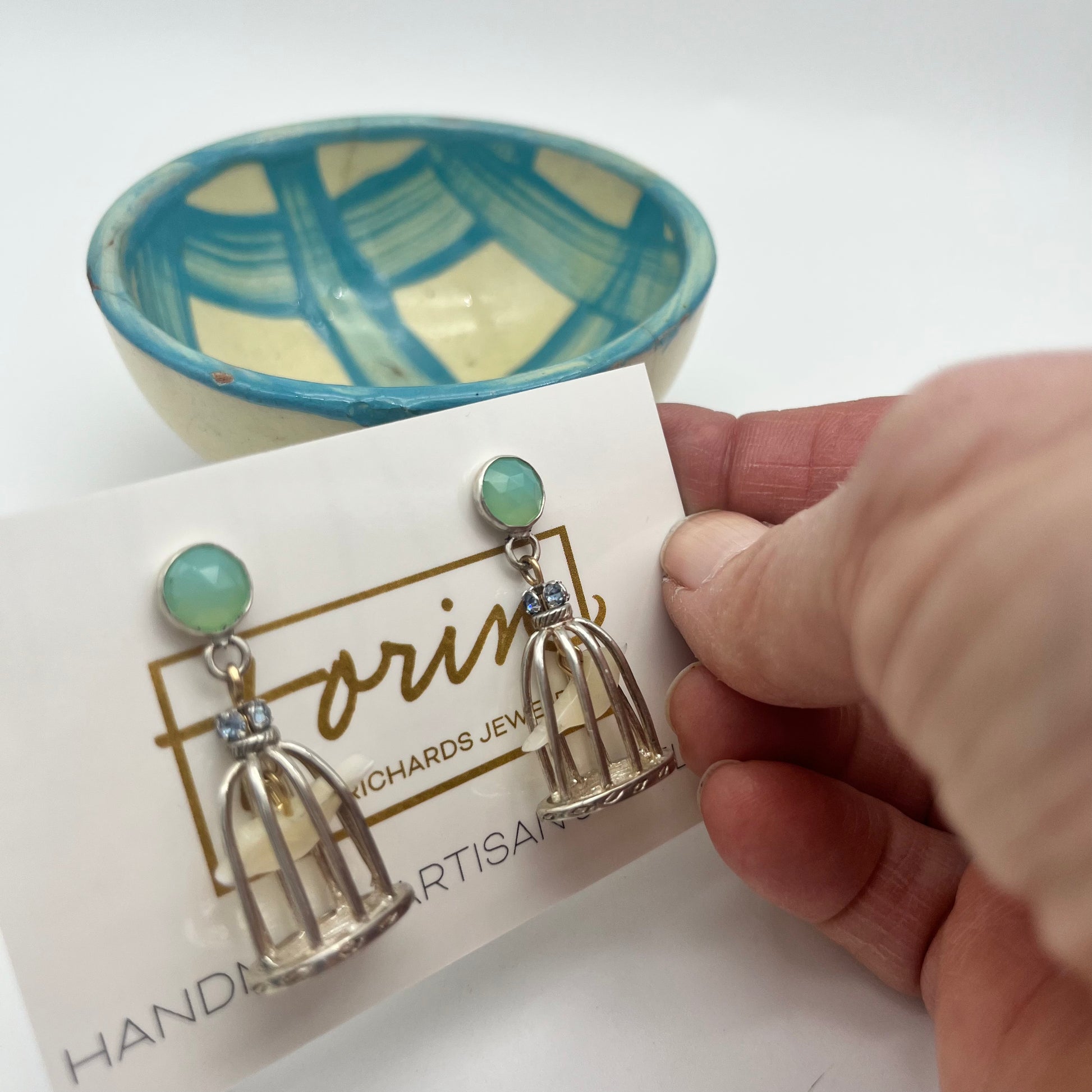 Sterling Silver bird cage earrings, vintage shell bird perched inside, 8mm round pale blue chalcedony stone post tops, tiny green swarovski crystal detail. measures 1 1/2" top to bottom
