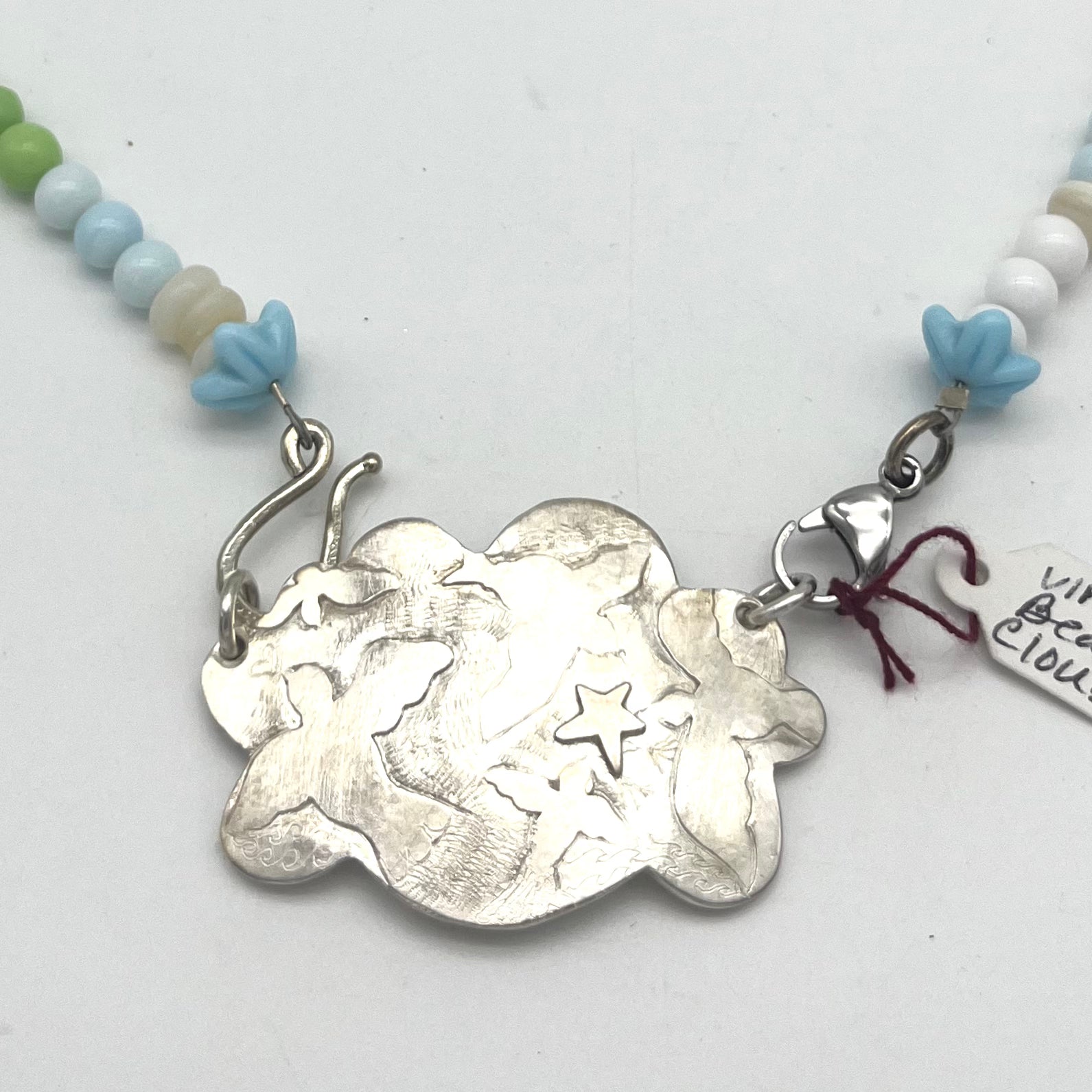 Birds in flight Cloud Necklace, bird imagery and clouds are reminders to Look up and to #Soarhigh. Multi -color fabulous Vintage glass Beads measure 17" and can be worn separately.