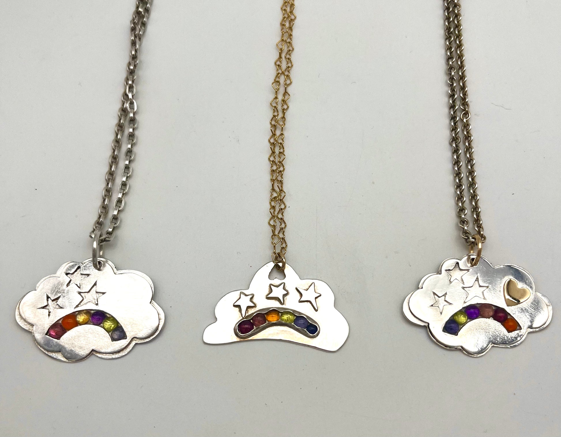 - sterling silver cloud charm with colorful rainbow with semi-precious cabochons, tanzanite, peridot, amethyst, tourmaline, garnet, carnelian, and 14karat yellow gold heart and bee and hook clasp, chain is 4mm oval cable chain.