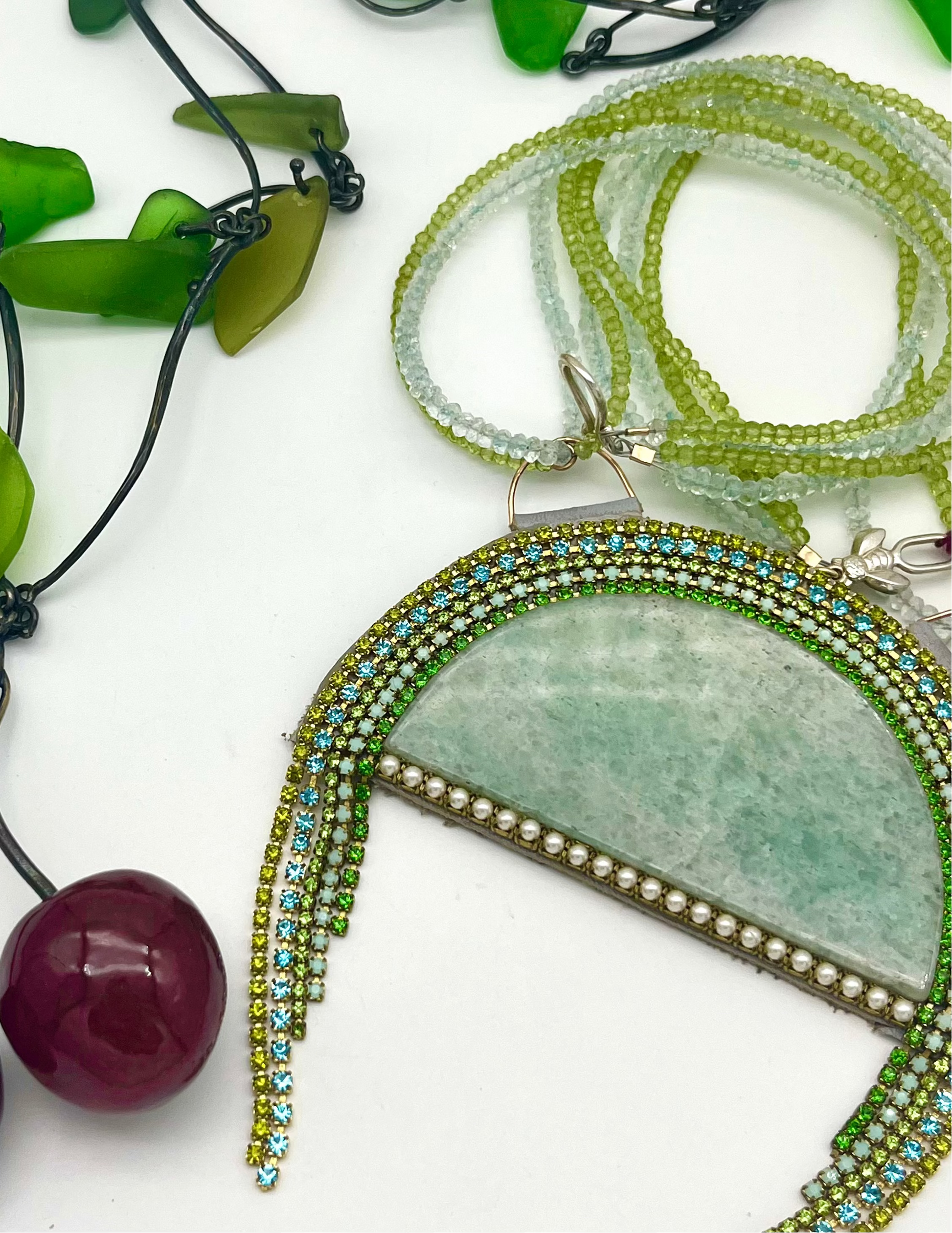 Beautiful large 4" wide semi precious gem stone arch surrounded by Swarovski crystal chain, adds sparkle and movement, perfect statement necklace, Light weight and fun to wear.