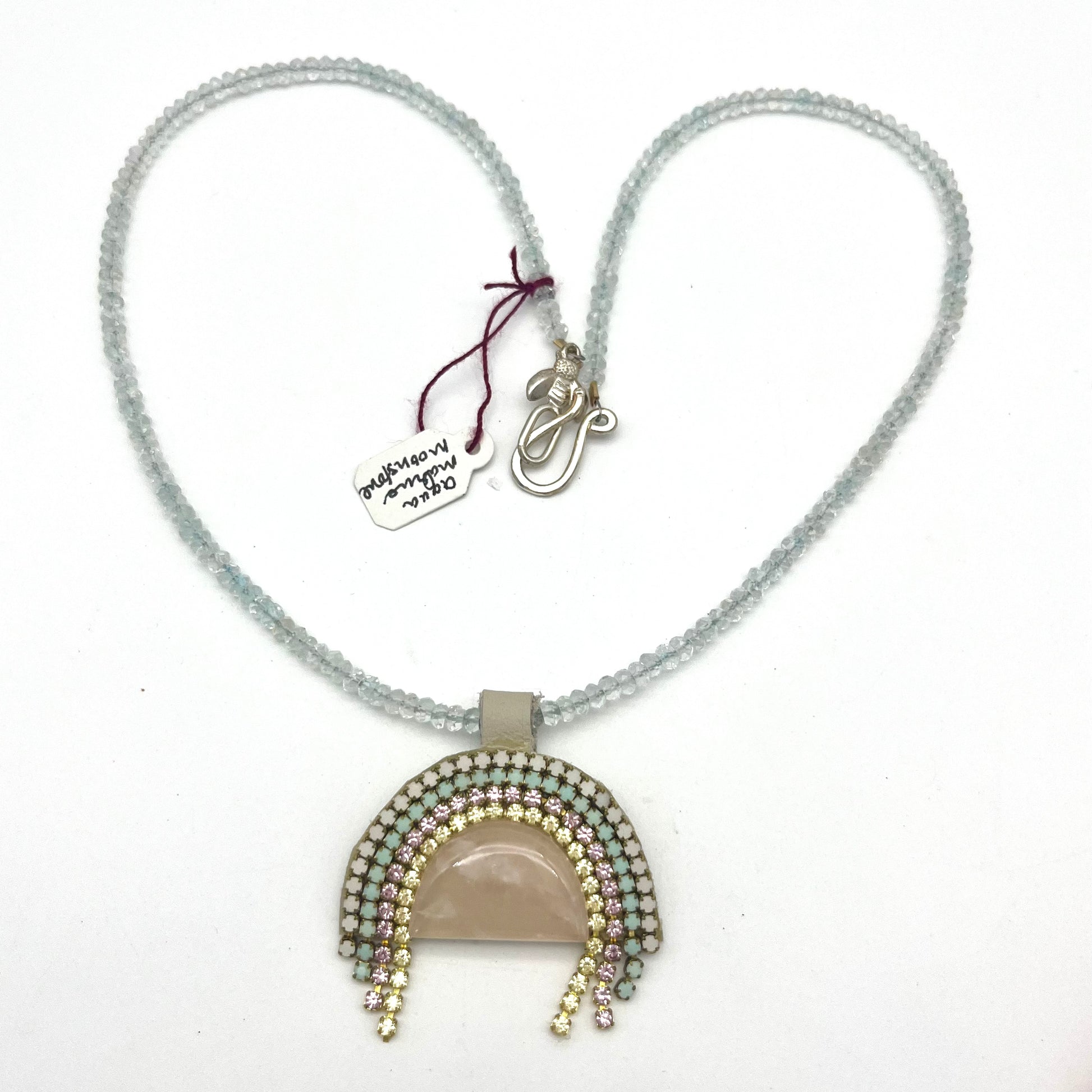 Rose Quartz semi -precious arch surrounded by Swarovski crystal chain. Which add sparkle and movement. Light weight and fun to wear. The back is made with leather and tiny shell heart. Arch pendant sits on faceted 4mm aquamarine bead strand.