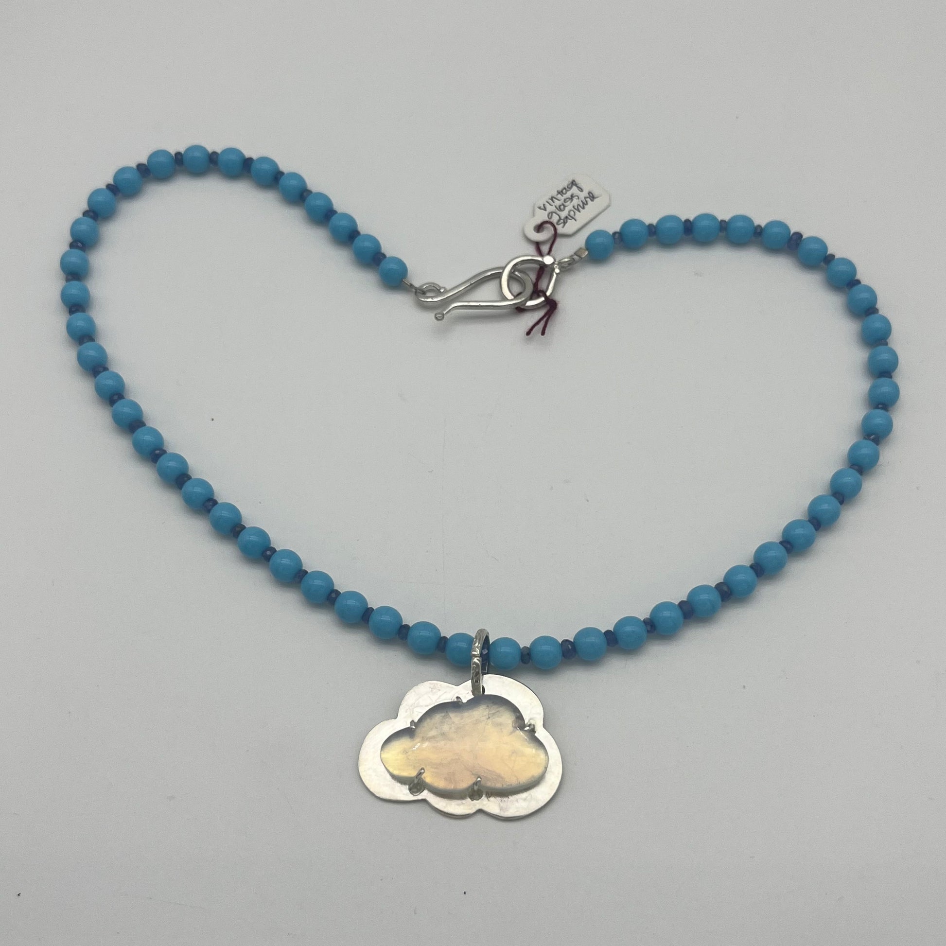 Cloud pendant sits on 6mm smooth round blue glass beads. the beads are dotted with tiny Sapphires... Hand made by Torin in Providence RI home studio, woman owned business