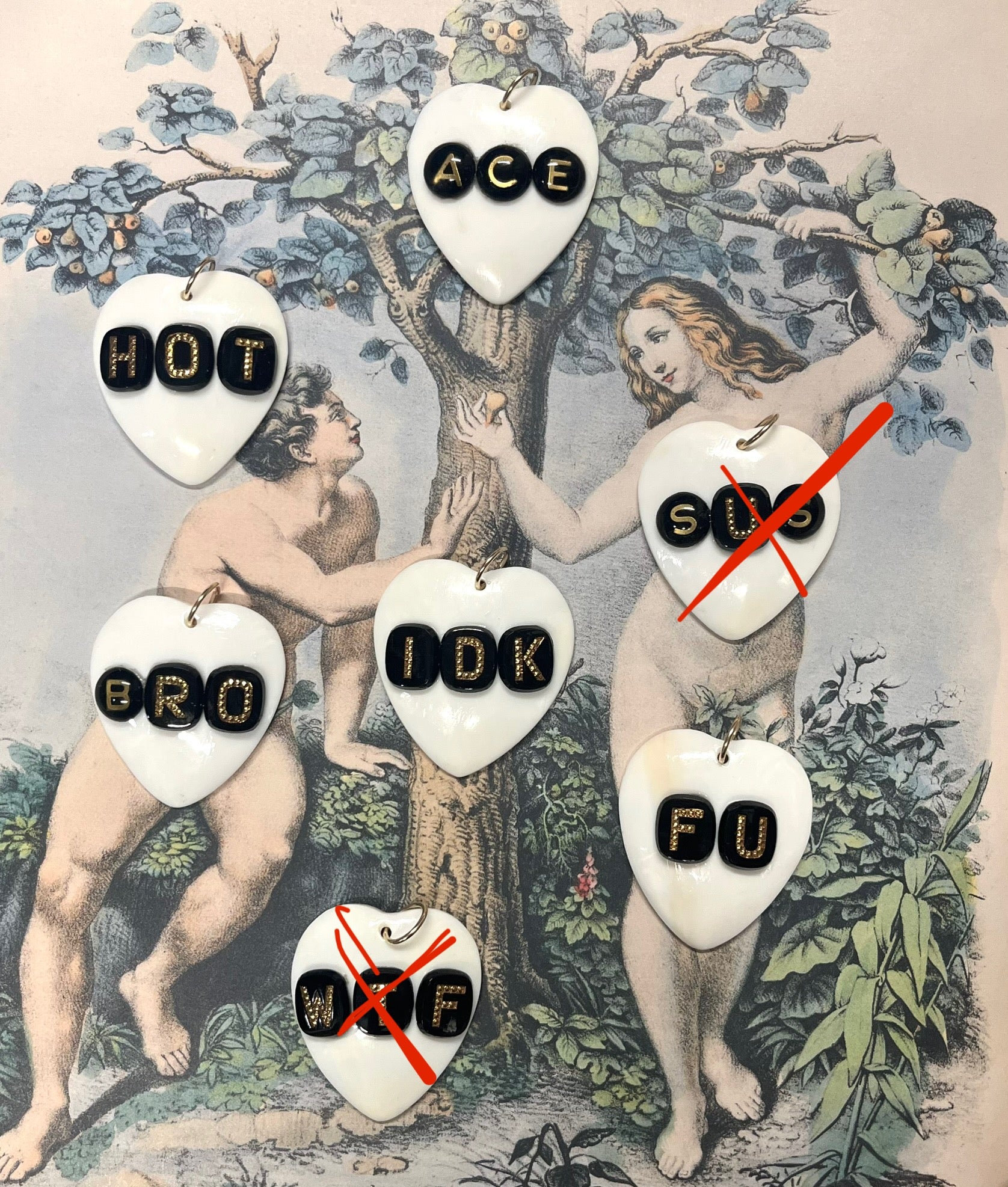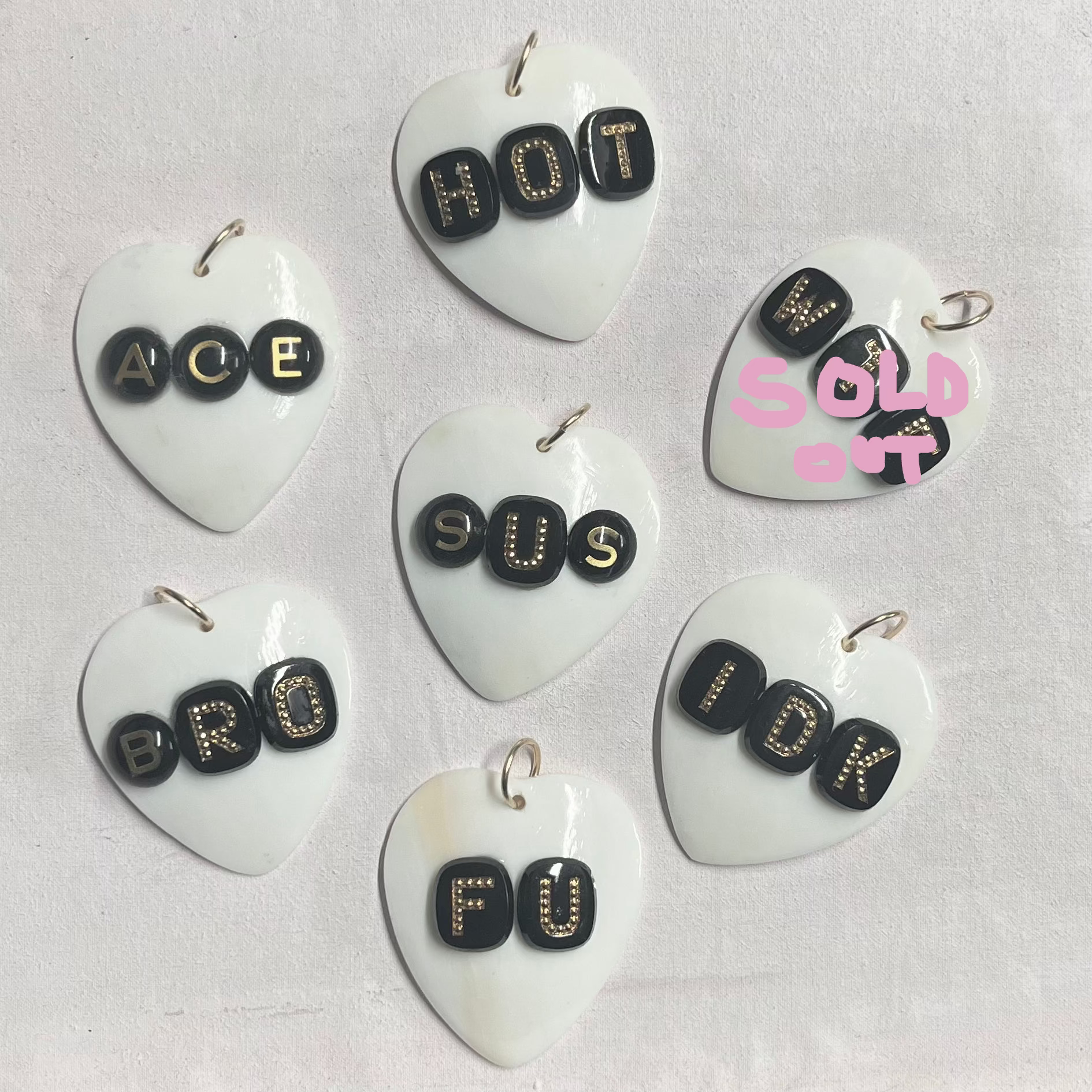 large white vintage shell charms, antique glass letters and gold details, each measures aprox 3" by 2" Fun conversation pieces. easily slide onto to most chains and beads. Express yourself, and have fun with your necklace stack. I wear mine on a long chain Pile it on....